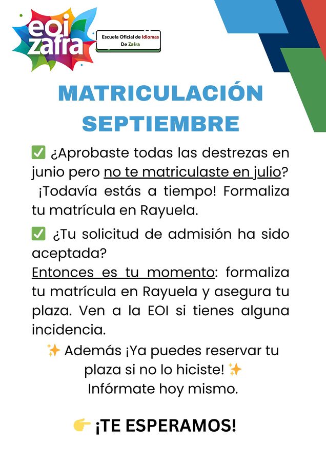 Ante cualquier duda/incidencia no dudéis en contactarnos en el 924 029 920 o en el correo: eoi.zafra@educarex.es.